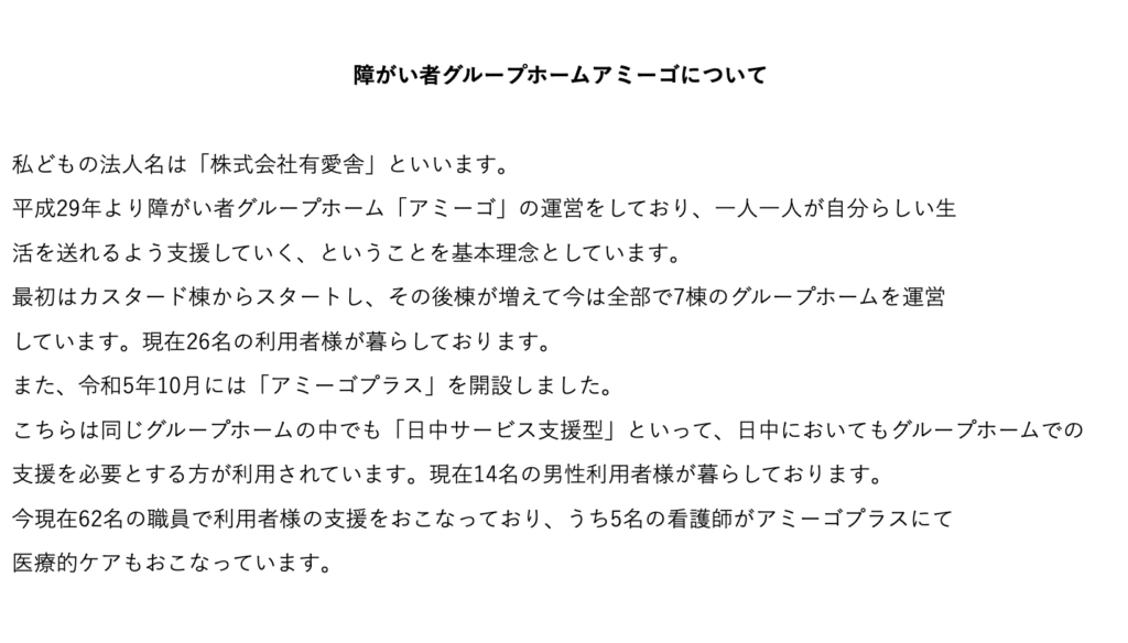 地域連携推進会議を行いました 2025 8/05 お知らせ 2025年8月5日 2025年7月17日に、地域連携推進会議を行いました。 利用者様、利用者様ご家族、地域の方、福祉に知見のある方、行政の方を招いての初開催となりました。 地域の方に「障がい者グループホーム」とはどんなところなのか知っていただくきっかけになりました。 お知らせ アミーゴでは各ホーム外食やテイクアウトで食事会をしました スタッフ大募集!!【お仕事説明会開催します】1/16、1/17、1/18 関連記事 スタッフ大募集!!【お仕事説明会開催します】1/16、1/17、1/18 2025年12月19日 アミーゴで働きませんか?求人募集中です 2024年6月19日 アミーゴの採用サイトをリリースしました! 2024年3月19日 介護サービス包括型のグループホームの空室をご紹介します(はる棟) 2023年11月24日 介護サービス包括型のグループホームの空室をご紹介します 2023年11月16日 日中サービス支援型のグループホーム、アミーゴプラス茂原東郷がオープンしました! 2023年10月3日 アミーゴでは本入居の前に体験入居できます。 2023年9月30日 2日間の内覧会が無事に終わりました 2023年9月25日